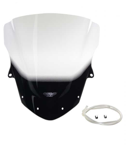 It feels good on the racetrack as well as on winding country roads: the medium-class ninja with quickshifter and LED headlights. The racing windscreen (R) is 35cm long and has a clear curvature in the middle which is modelled on the helmet shape, also known as the “double bubble”. The racing windscreen is available in colourless, smoked grey and black.