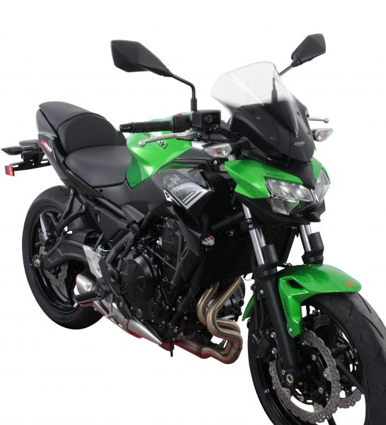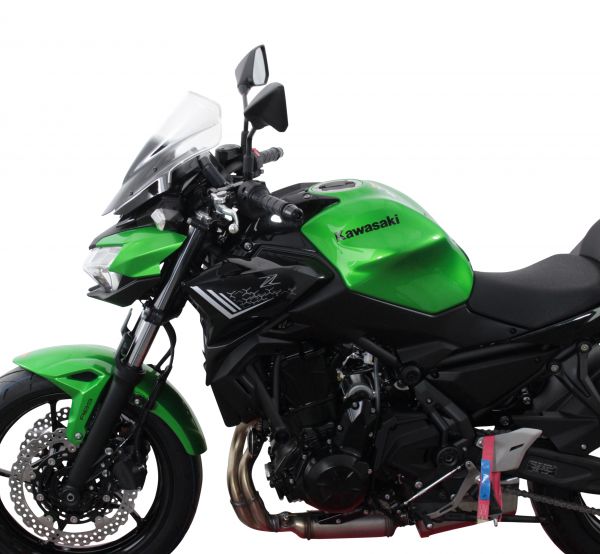 The Z650 turns out to be a Naked Bike with comfortable driving properties, which works reliably on winding roads. The bicycle which weighs only 188 kg gets along very well with its 68 HP. If you normally drive without windscreen, the MRA racing screen (NRN) and its total length of 34 cm provide noticeable protection from wind pressure. The racing screen is fastened at the bicycle by means of sheets the required accessories is included in the scope of delivery. The racing screen is available in transparent, grey and black.